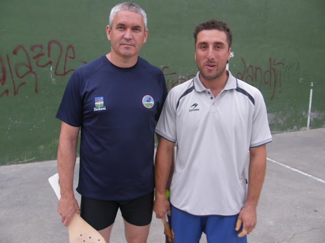 Después, los máximos favoritos, los verdadedos capos de esta cancha, Eloy e Igor Tajada, sin jugar bien, han vencido 25--17 a los Etxebarria, y han acabado con su sueño. Bastante mermado hoy Koloma, con una ampolla sin curar en la mano derecha, que llevaba la pelota a buena pero le dejaba a placer  la bola a Igor Tajada. Los galipos han comenzado fatal, y perdían 2--8, pero su  maestría para manejar los partidos les ha hecho empatar a 8 tantos y comenzar, poco a poco, a abrir diferencias en el tanteador. No se puede pedir más a los de Sanfuentes, que han completado un torneo soberbio llegando a semifinales. Tras el 2--8 en contra, Eloy ha pasado a jugar de zaguero y creo recordar que sólo ha perdido una pelota desde esa posición.  Javitxa y Koloma han estado valientes, atrevidos y luchadores, han sacado temperamento, y perdido como campeones, de la misma manera que han ganado Eloy e Igor Tajada.